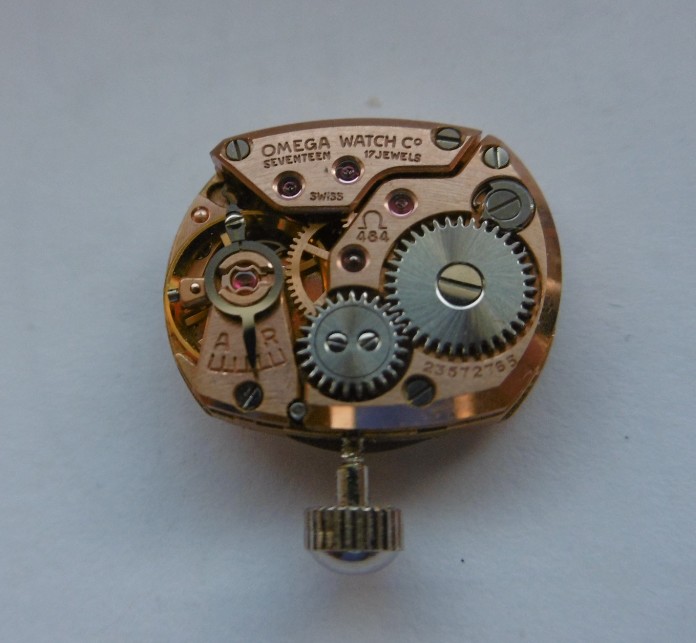 Movement is of the famous caliber 480 series, 484 with Incabloc shock protection and antimegnatic. The bronze movement is signed Omega Watch Co., Swiss.